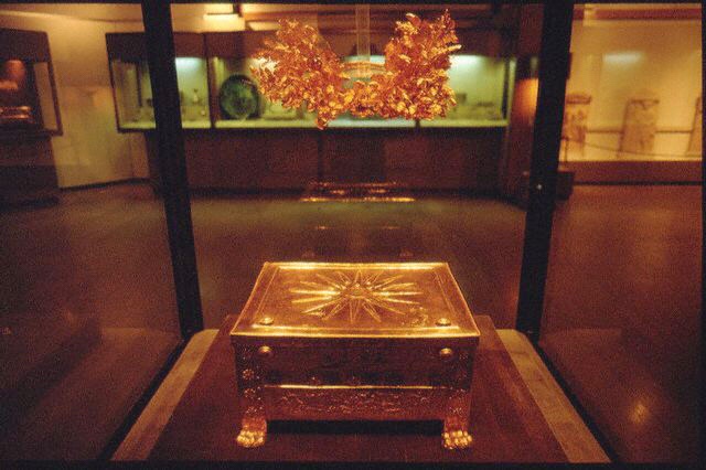 Der Goldene Larnax (Chrysi Larnaka) mit dem Stern von Vergina, ein sechzehnstrahliges Sonnensymbol, auf der Oberseite enthält vermutlich die sterblichen Überreste des Königs Philipp II. von Makedonien, darüber schwebend ein goldener Eichenkranz. Foto und Text aus Wikipedia http://www.vergina.Meteora