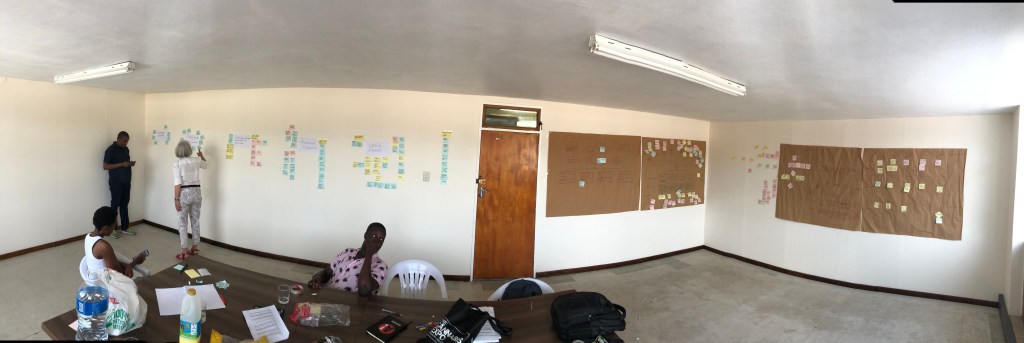 M. Heute sind wir sehr zufrieden. Haben viel und intensiv gearbeitet (der Leiter, Matsetsebale, der immer ziemlich viel redet, war nicht da). Jetzt hängen alle Wände voller Wandzeitungen. Als wir fertig waren mit dem, was wir uns vorgenommen hatten, haben wir uns allgemeineren Themen zugewandt und uns besser kennen gelernt. Thabang erzählte, dass es neben Afrikaans und Englisch noch neun einheimische Sprachen gibt, viele mit Klicklauten. Diese sind je nach Sprache verschieden und für uns unaussprechbar.