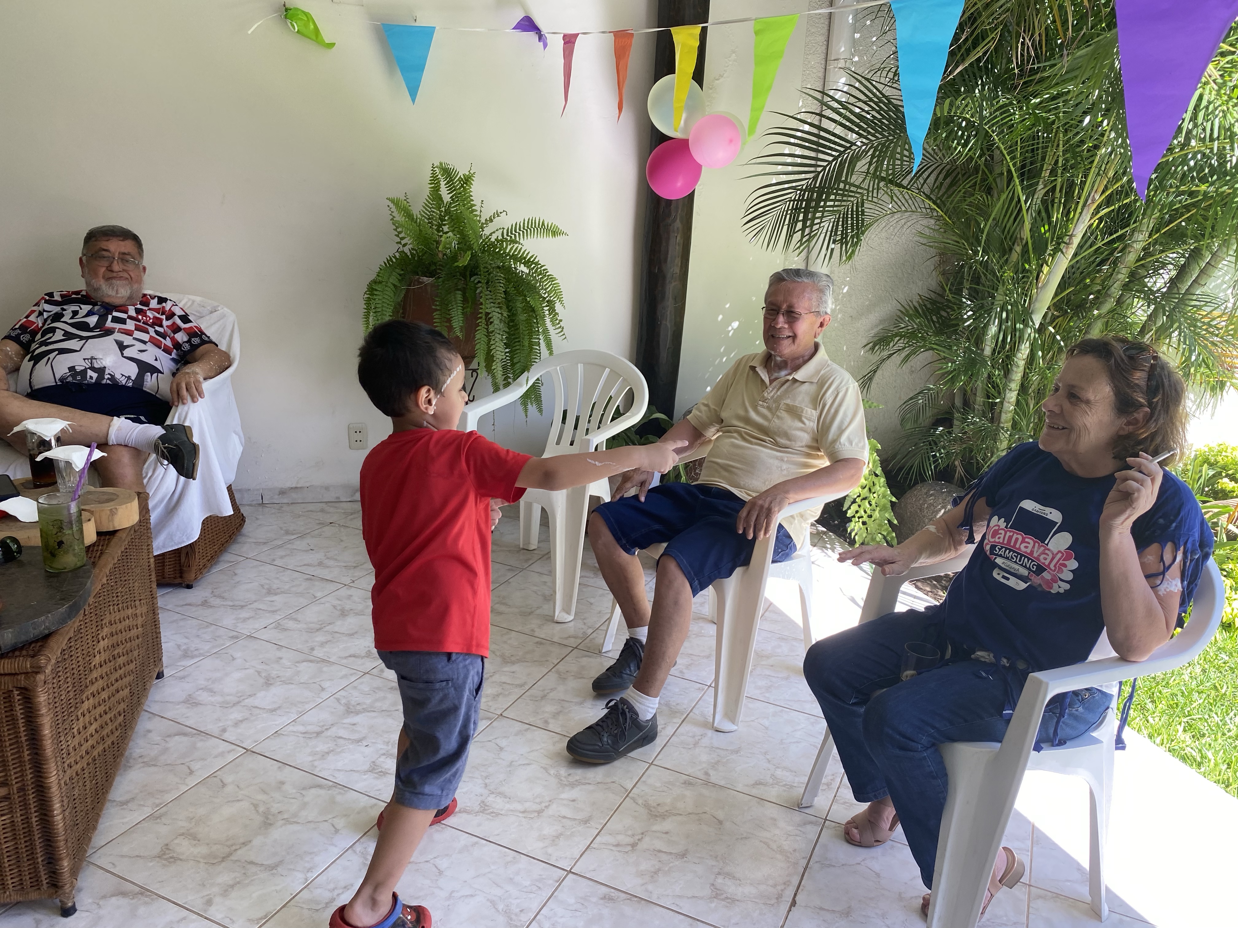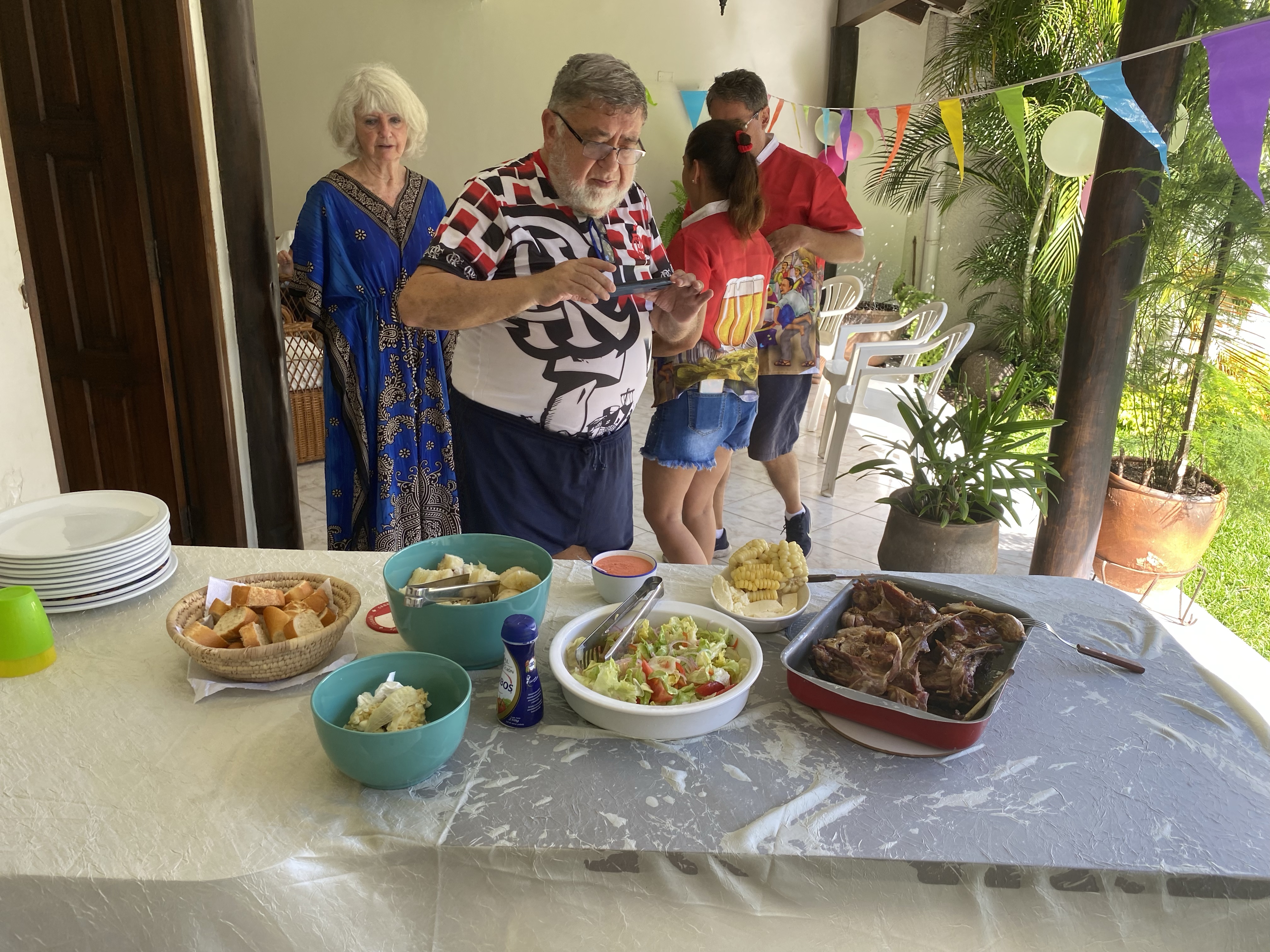 Wir haben doch Karneval gefeiert. Im Kleinen. Bei Karen und Alfredo im Garten. Die zwei Kinder warfen Luftballons mit Wasser gefüllt auf der Wiese rum, wie Erwachsenen saßen wie Erwachsene auf der Terrasse. Ich habe Mojitos gemacht, die Omas haben Luftballons gefüllt und Hammel im Ofen gegrillt. Dann haben sie uns mit einer Sprühdose mit farbigen Schaum besprüht, Karnevalsmusik erklang im Hintergrund und wir waren alle lustig. Das klingt jetzt nicht so, aber es war so. Ich hab dann Luftballons mit dem Hut aufgefangen, aber sie sind nicht auf meinem Kopf explodiert. Der Jüngste hat sich einen Eimer Wasser übergeschüttet und das Ziel erreicht. Er war nass und verschmiert. Bei 34 Grad nicht schlimm. Dann gab’s Maiskolben mit Käse, danach Hammel köstlich und Yuka und hinterher Torte aus der Schachtel. So kann man auch mit kleinen Sachen den großen Leuten Freude machen.