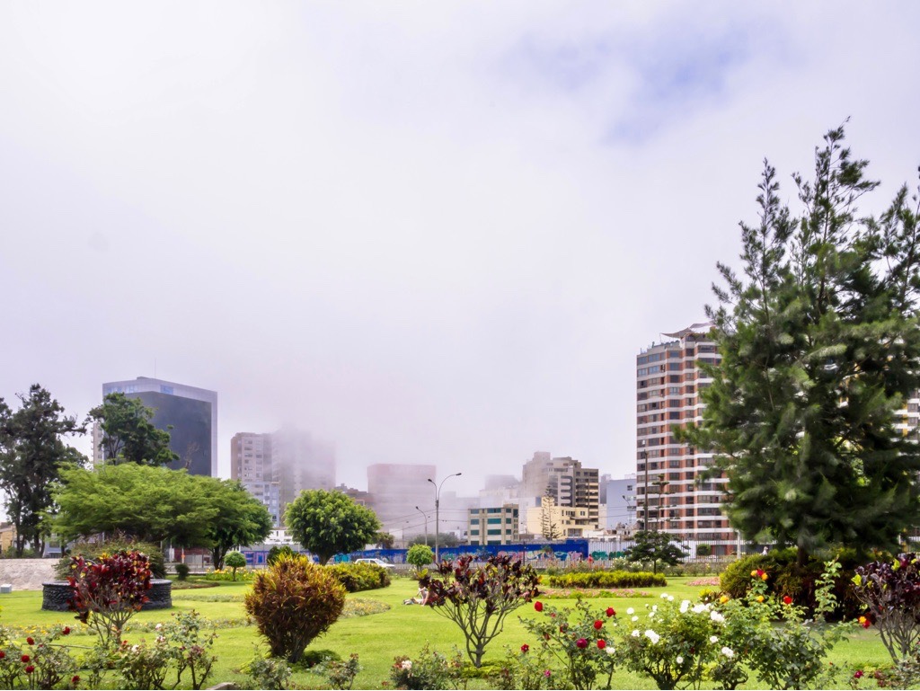 Lima hat ein prima Klima. Für eine in den Tropen gelegene Stadt sind die Temperaturwerte recht niedrig. Ein Grund für dafür ist der relativ kalte Humboldtstrom, der das Land abkühlt. Und besonders im Winter, also von Mai bis Oktober, kondensiert Wasserdampf in der Luft über dem kalten Ozean und sorgt für den berühmten Küsten- oder Hochnebel, der die ganze Stadt einhüllen kann. Fährt man 50 km weit ins Land, ist strahlender Sonnenschein.