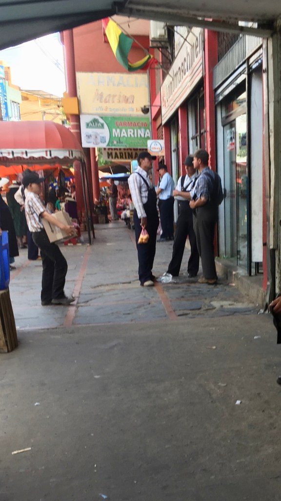 In Santa Cruz kommt man am großen Markt um die Ecke und dann sind sie da, die hochgewachsenen Männer in ihren blauen Latzhosen mit Cowboyhut oder Baseballmützen, die Frauen in langen Röcken mit Schürze, breiten Strohhut, der mit einem Band unterm Kinn geknüpft ist und den weißen Wollstrümpfen, die bei Hitze sicherlich mächtig kratzen. Sie stehen herum, kaufen ein, verkaufen ihre Produkte und verschwinden wieder so schnell sie können aus dem Sündenbabel.