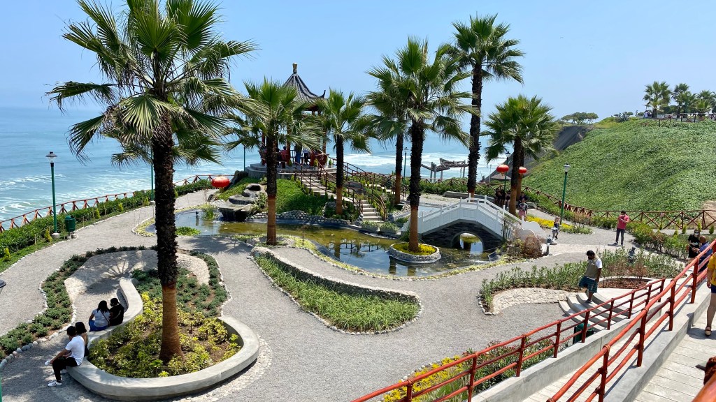 Und im Parque Chino mit dem Fischteich und den Tempelchen. Eine schöne Aussicht von da bis zur Insel. Erklärt mal den Kindern, warum die lachenden Buddhas Geld kriegen.