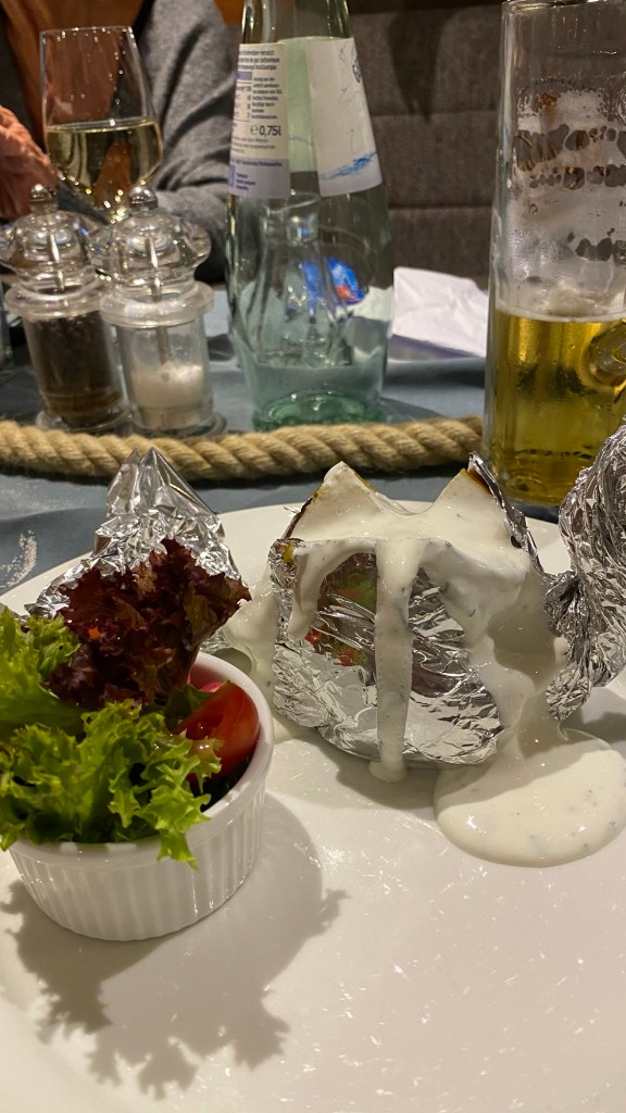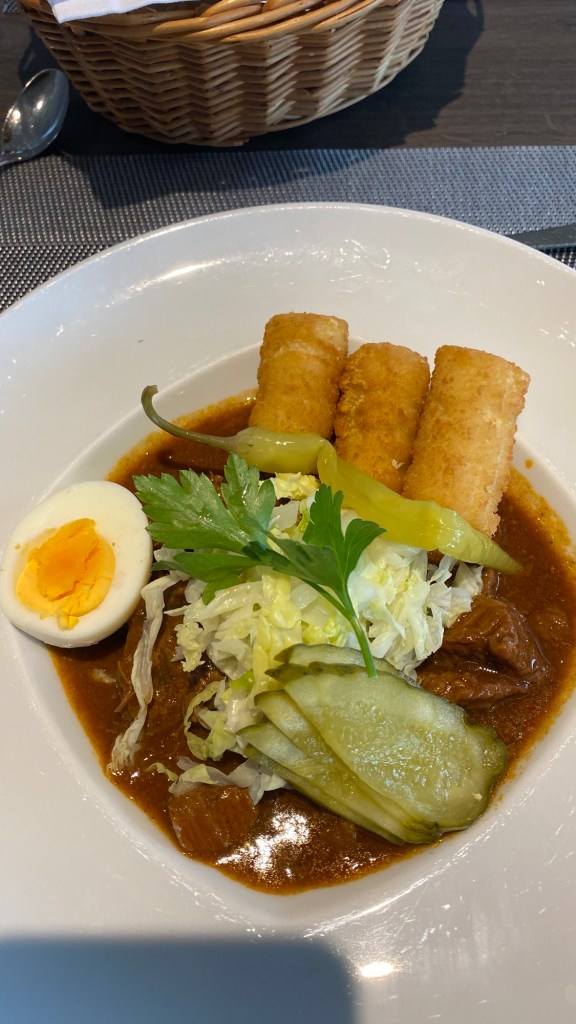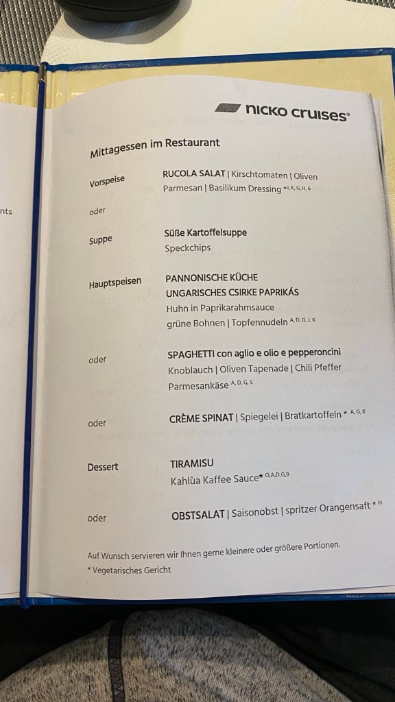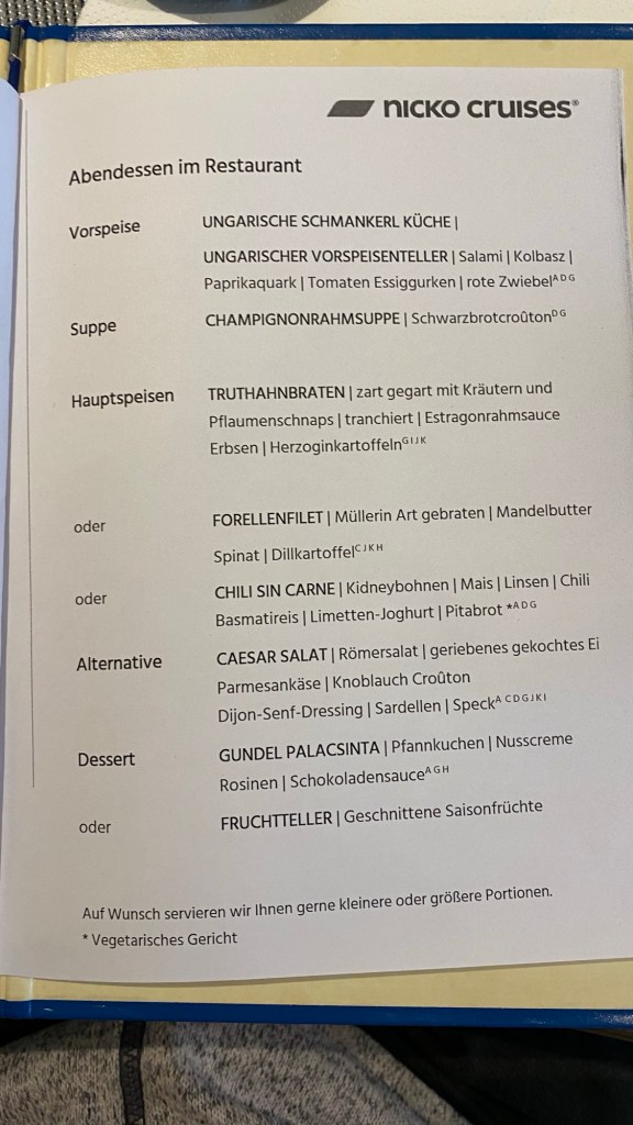 Das Essen auf dem Schiff ist klasse! Täglich gibt es Gerichte aus den durchfahrenden Gegenden. In Ungarn gab’s natürlich Gulasch.