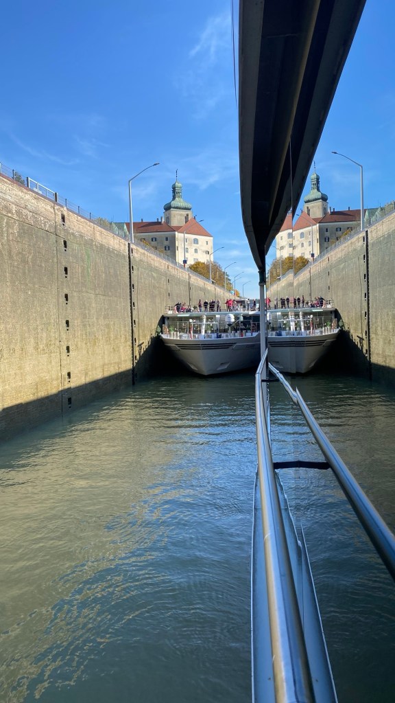 Seit ich in Wikipedia las, dass ein Schlepper mit Erz beladen in der Schleuse plötzlich 11 m tief auf Grund gesunken ist, bin ich des Nachts bei jedem Bums des Schiffes an die Schleussenwände aufgeschreckt, jetzt klingelts gleich Alarm und wir samt Gepäck landen in der Donau.