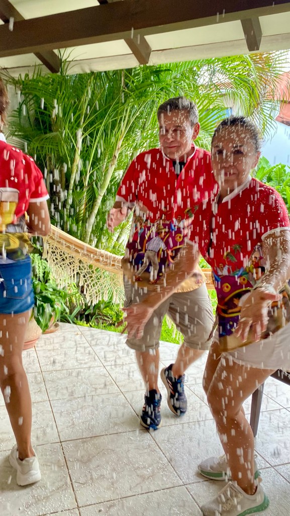 Gute Laune, Wasser und Schaum in Dosen: das Essen findet in Wohnzimmer statt und die Feier auf der Veranda und im Garten.