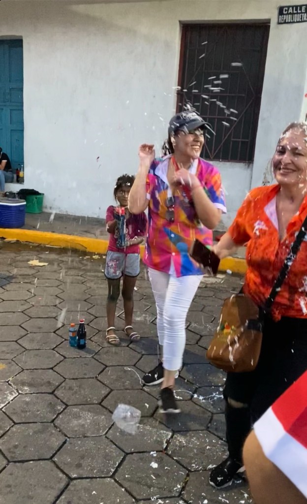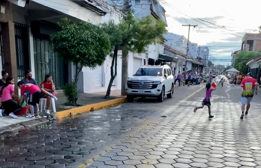 Straßenkarneval in Santa Cruz besteht im Wesentlichen aus Wasser, geworfen, gespritzt, geschüttet mit Kübeln, Eimern, Schläuchen, Wasserpistolen (gigantischen), in Luftballons, allem, was nass macht. Wenn es hoch kommt, auch mit Farbe, einen hässlichem schwarz-grau oder violett. Und Schaum, gesprüht mit Dosen. Und alles lacht, lacht sich schubbelig. Sowohl der Wasserwerfer als auch der Getroffene. Dann trinken sie einen zusammen. Mich haben kleine Mädchen mit Spülschüsseln voll Wasser schlussendlich erwischt. Ich war zumindest links bis Mitte pudelnass. Von oben bis unten. Macht mir doch Spaß, kleinen Mädchen Freude zu bereiten 🙂