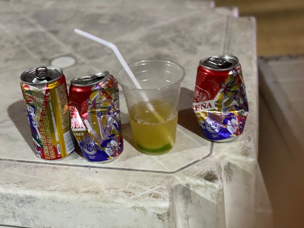 Erinnere an Ecuador, Guaranda, eine Stadt oben in den Anden, berühmt für seinen Karneval. Von Dächern, aus Türen und Fenstern kamen Eimer voll Wasser. Menschen sprangen in den Brunnen, nass konnte man nicht genug werden. Das alles bei einer Temperatur 15 Grad weniger denn hier. Da oben kriegten wir nach dem Schütten einen selbst gebrauten Rachenputzer. Um wenigstens von innen warm zu werden. Das brauchte es hier nicht. Die Temperatur blieb bis spät Nachts angenehm warm. Und das Bier angenehm kalt.
