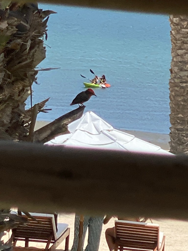 Warum fotografieren sich Frauen dauernd unten am Strand? Auch die nicht so Schönen (aber Reichen). Diesmal Gott sei Dank kein Mafia Boss in Sicht wie letztens. So ein Mafia Boss kann bestimmt voll bezahlen für sich und seine Lieben, derweilen Schwarzgeld hier nicht stinkt wenn’s bar ist. So viel zu meinen schmutzigen Fantasien. Ein Bodybuilder-Gringo liegt vorne wie ein Flunder auf der Liege und möchte wohl seine Käsefarbe in ein angenehmes Braun umwandeln. M darf nicht mehr zwengs Hautkrebs und ich nicht wg. Bronchitis. Purer Neid, ich gebs zu. Wir alle mögen gerne dunklere Hautfarben. Komisch. Dunklere Menschen kommen nicht so gut an. Der kleine rot behütete Vogel auf dem Foto sitzt gerade auf der Palme vor mir