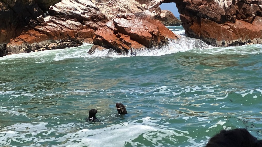 Ich musste ihn nicht dauernd festhalten. Sehr hatte ich mich auf meine Lieblingstiere gefreut, und sie waren auch da. Man benötigte allerdings gute Augen und Durchsetzungsvermögen, denn als unsere Begleiterin ankündigte, dass wir gleich Pinguine zu sehen bekämen, standen alle 20 Touristen gleichzeitig auf und drängten mit gerecktem Handy nach links. Dort waren sie, fünf Stück, winzig klein auf einem hohen Felsen. Wie sie mit ihren kurzen Stummelbeinchen so hoch klettern können, ist mir ein Rätsel, und bei den Seelöwen bekamen wir eine Unterrichtsstunde in Schwimmen mit, Mutter und Kind, ebenfalls ziemlich weit weg und verdeckt von den anderen.