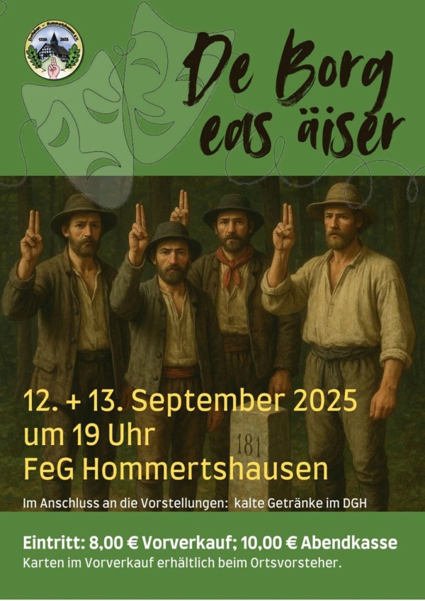 https://www.dorfleben-hommertshausen.de/700-jahre-hommertshausen/ 700 Jahre Hommertshausen Hommertshausen hat Geburtstag und das wollen wir an Pfingsten gemeinsam mit euch feiern! Samstag, 07.06.2025: Um 17:30 Uhr findet auf dem Hommertshäuser Friedhof ein Totengedenken mit Kranzniederlegung statt. Ab 18:30 Uhr laden wir zu einem gemeinsamen Festkommers ins Festzelt ein. Dort werden u.a. der Dorfklang sowie der Kinderprojektchor mitwirken. Nach dem offiziellen Fassanstich durch Schirmherr... Continue Reading →